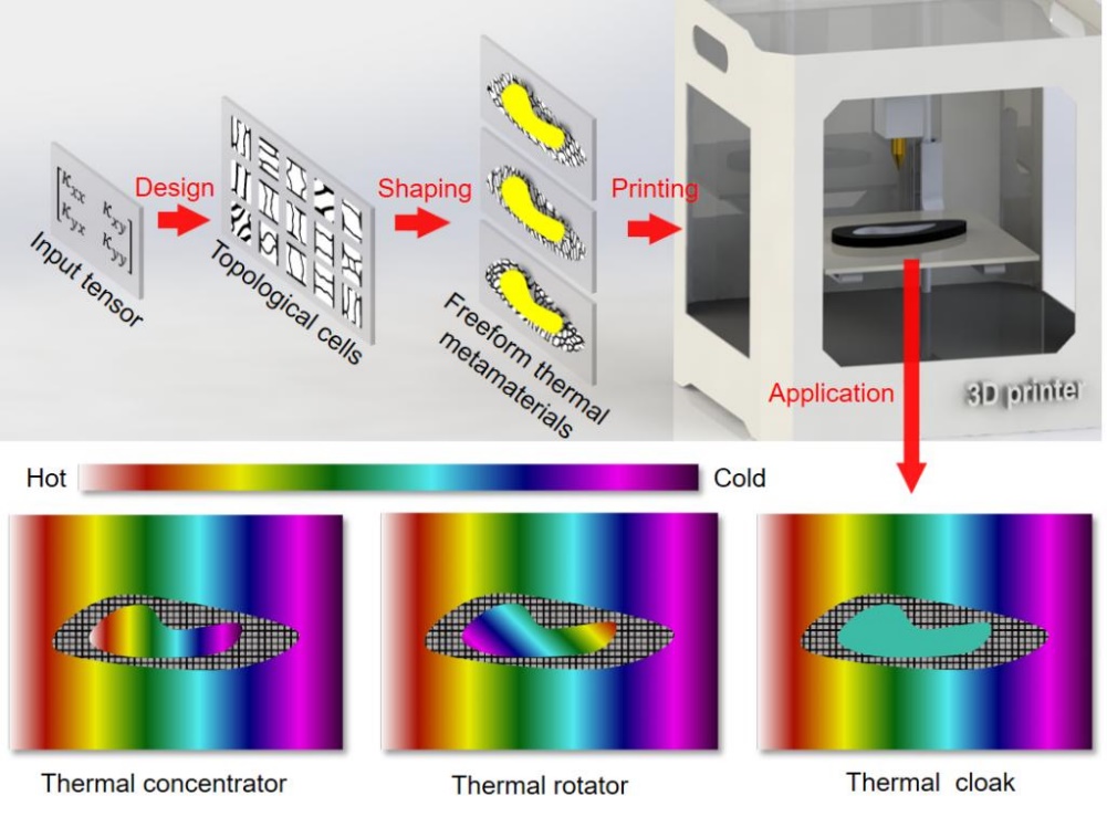 12月10日,《自然·通讯》(Nature Communications)在线刊发了机械学院高亮教授团队与新加坡国立大学仇成伟教授、能源学院胡润副教授关于热超构材料拓扑优化设计的最新研究成果“Robustlyprintable freeform thermal metamaterials(稳健可打印的自由形状热超构材料)”。机械学院博士生沙伟、副教授肖蜜为论文共同第一作者,高亮教授、仇成伟教授、胡润副教授为论文共同通讯作者,华中科技大学数字制造装备与技术国家重点实验室为论文第一完成单位。 超构材料因具有常规自然材料不具备的属性被学术界和工业界广泛关注,如力、热、声、电磁超构材料等,其中热超构材料因可操控热流获得一系列超常热学功能(如:热隐身、热集中、热伪装、热旋转等)备受关注。随着变换光学和散射抵消方法应用于热学领域,一系列具有不同功能的热超构材料纷纷被设计和制备,但是,目前热超构材料设计仍面临三大挑战:(1)利用变换热学法设计的热超构材料需采用非均匀、各向异性的材料参数,而常规材料往往不具备,使得实验制备热超构材料难度很大;(2)热超构材料结构形状受限,目前以圆形、椭圆形等规则形状的热超构材料制备居多,影响了热超构材料的工程适用性;(3)采用数值优化方法设计热超构材料依赖背景温度场和目标超常热学属性,影响了设计的灵活性和热超构材料的全方位功能性。因此,如何设计并制备具有自由形状且全方位功能性的热超构器件是热超材料领域亟需解决的难题。 图1 稳健可打印的自由形状热超构材料拓扑优化设计 针对以上难题,研究团队提出了一种稳健可打印的自由形状热超构材料拓扑优化设计方法(图1),采用拓扑优化设计具有指定导热系数的拓扑功能单胞,组装生成热超构材料,开展了自由形状热超构材料拓扑优化设计-热超构器件增材制造-热学仿真与实验性能测试。研究团队按照上述思路,设计了具有自由形状的热集中、热旋转和热隐身等三类热超构材料构型,并开展了数值仿真(图2)和热学实验(图3)性能测试,结果表明无论热流从何种方向通过三种热超构材料,其内部各自呈现出良好的热集中、热旋转和热隐身效果。 图2 拓扑优化设计的三种热超构材料及其数值仿真温度场分布(左:热集中;中:热旋转;右:热隐身) 图3 3D打印制备的热超构器件及其热学实验温度场分布 研究团队采用拓扑优化方法设计了具有自由形状、全方位功能性的热集中、热旋转和热隐身超构材料,达到了当前利用混合材料结构实现热超构材料设计的最好水平,将有力推动热超构材料在航空航天、电子等领域的工程应用。研究工作得到了国家自然科学基金(52076087)、国家重点研发计划(2020YFB1708300)等项目资助。(原文链接://mp.weixin.qq.com/s?__biz=MzU1OTI0NjU0Mw==&mid=2247484318&idx=2&sn=29300743467c0a4f98e40c28e609e3ed&chksm=fc1b7e3ecb6cf72807021182ce55d71e1e8531abb50c660a871555a2332b315eb8d9bb3254c6&scene=27)