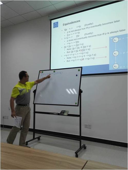 该课程为双语教学,共18学时。约20位研究生及青年教师全程参与了该课程。整个教学过程中既有严谨的数学推理,巧妙的算法思想,也有具体的实例演示,受到了选课同学的一致好评。冯雷博士也表示希望大家能在各自的科研工作中,考虑结合模型检验技术思想开展科研工作。