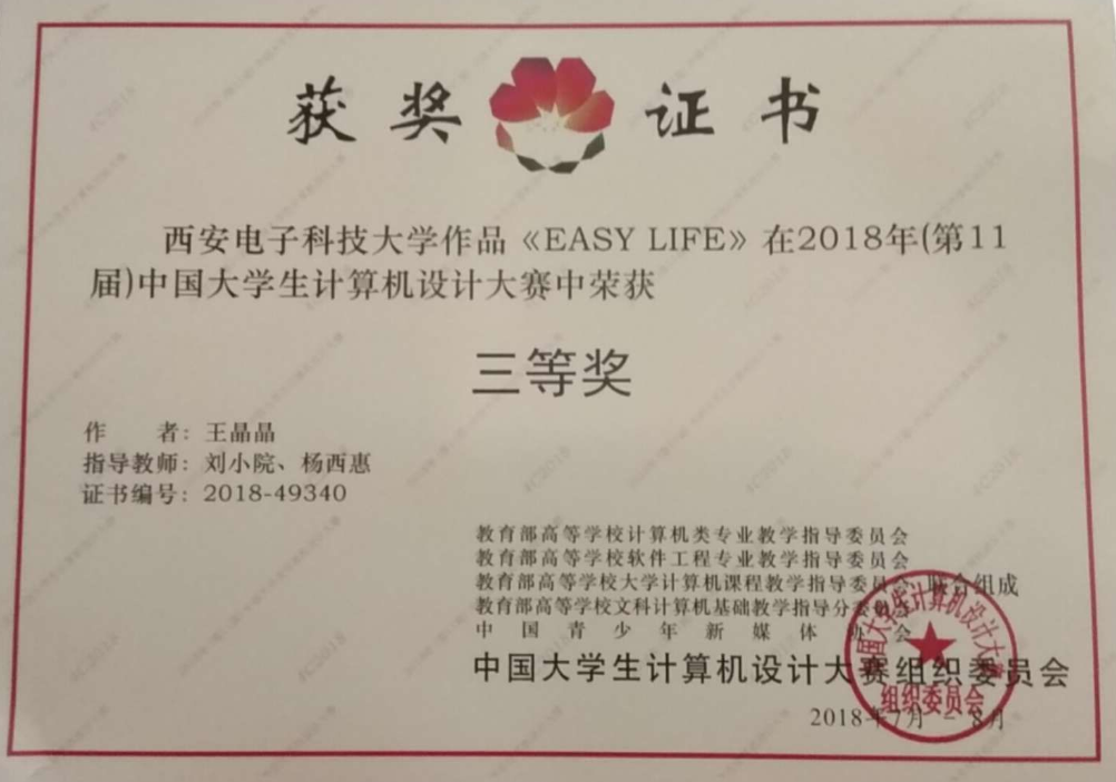 中国大学生计算机设计大赛是由教育部高等学校计算机类专业教学指导委员会、软件工程专业教学指导委员会、大学计算机课程教学指导委员会、文科计算机基础教学指导分委员会、中国青少年新媒体协会联合举办的国家级赛事。该赛事是根据国家有关高等学校创新能力提升计划、进一步深化高校教学改革、加强教学实践、促进教学相长,切实提高计算机教学质量,运用信息技术解决实际问题的综合能力,为培养学生的创新创业能力与团队合作意识,造就更多的德智体美全面发展人才而开展的公益性、非营利性、科技型的群众活动。