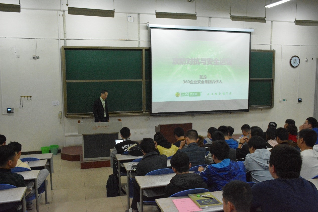 联合主办的学业导航报告会在南校区B楼433教室顺利展开,西电97届校友、360企业安全集团合伙人张龙以“攻防对抗与安全运营”为主题给到场的学生做了报告。