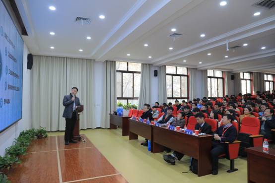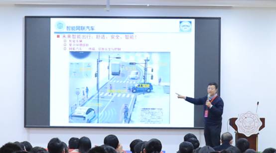 之后,由赵剑教授作“基于多源信息融合的智能车辆感知与决策技术”,赵剑教授从汽车行业的现状与前景展开,为到场师生介绍了智能车辆发展中的所需实现的路线规划、事故降低等要素,由此引入,讲解了人车路协同感知技术、车辆安全技术及智能车辆的整车设计技术。
