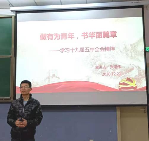 于北校区阶梯教室305进行了十九届五中全会精神宣讲活动,并取得圆满成功。此次宣讲会的宣讲人为研究生支部书记张建伟,主题为“做有为青年,书华丽篇章”。h漫