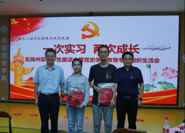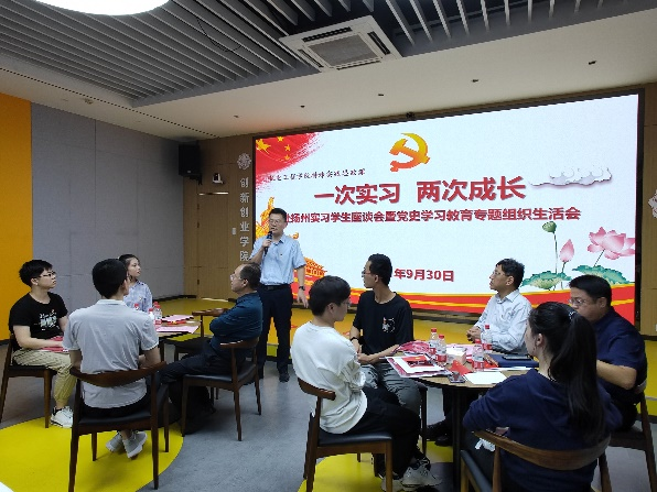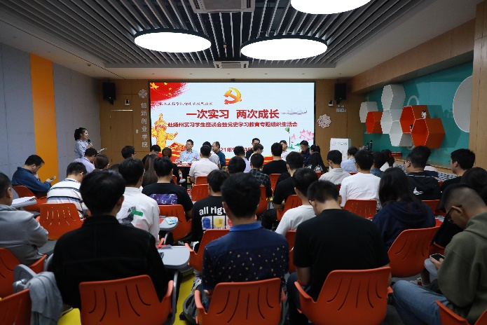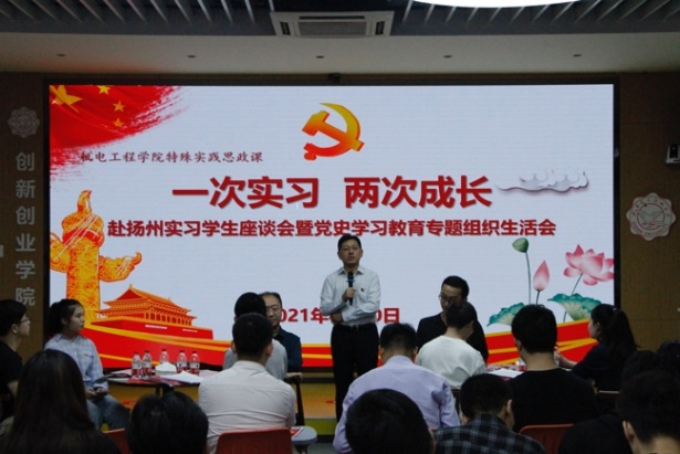 在大学生活动中心116报告厅举办“一次实习,两次成长”赴扬州实习学生座谈会暨党史学习教育专题组织生活会。校党委副书记、副校长任小龙,党委学生工作部、学院主要负责人,部分教师代表以及2018级电子封装专业赴扬州实习的全体36名同学参加座谈会。会议由h漫