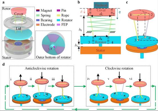低频机械振动能具有分布广泛、可再生、绿色环保等优点,可转化为电能以维持数量巨大、分布十分广泛的微小型传感器的正常工作,实现自维持、免维护传感器网络,但低频的特点导致其收集利用难度大。摩擦电效应可在低频振动作用下产生较高输出电压,但稀疏的脉冲形输出和材料磨损问题限制了摩擦纳米发电机的输出稳定性和寿命。针对以上难题,该团队受拉绳陀螺旋转动力学原理的启发,提出了一种可轴向滑动的绳驱转子,成功地将低频振动转换为高速旋转运动。在绳驱转子的基础上,该团队研制了一种旋转式摩擦纳米发电机,其输出频率相比外界振动频率提升了70倍,从而大幅提高了输出功率;同时,在外界振动和绳驱转子动力学的相互作用下,所研制的发电机可在滑动摩擦和静电感应两种工作模式间自动切换,既有效缓解了发电机的磨损问题,又保证了输出稳定性。最后,该团队利用所研制的摩擦纳米发电机成功地驱动微波传感器、温湿度计、电子表等电子器件正常工作,表明该摩擦纳米发电机在桥梁监测、轨道监测、发电地板等领域具有潜在的应用。