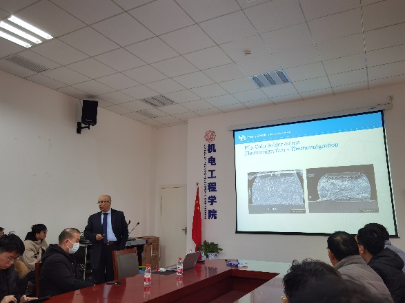 师生作了题为“Unified Mechanics Theory and Its Application in Degradation Mechanism Analysis of Electronics Packaging”的华山领航报告,重点介绍了封装焊点结构中的失效分析方法。合作团队负责人王卫东教授主持报告和后续交流环节。与会师生对Basaran教授的研究内容展现出浓厚的兴趣,进行了深入的交流研讨。报告结束后,中国工程院院士段宝岩在科技楼会见了Basaran教授,对后续电子封装学科的合作交流表示期待。