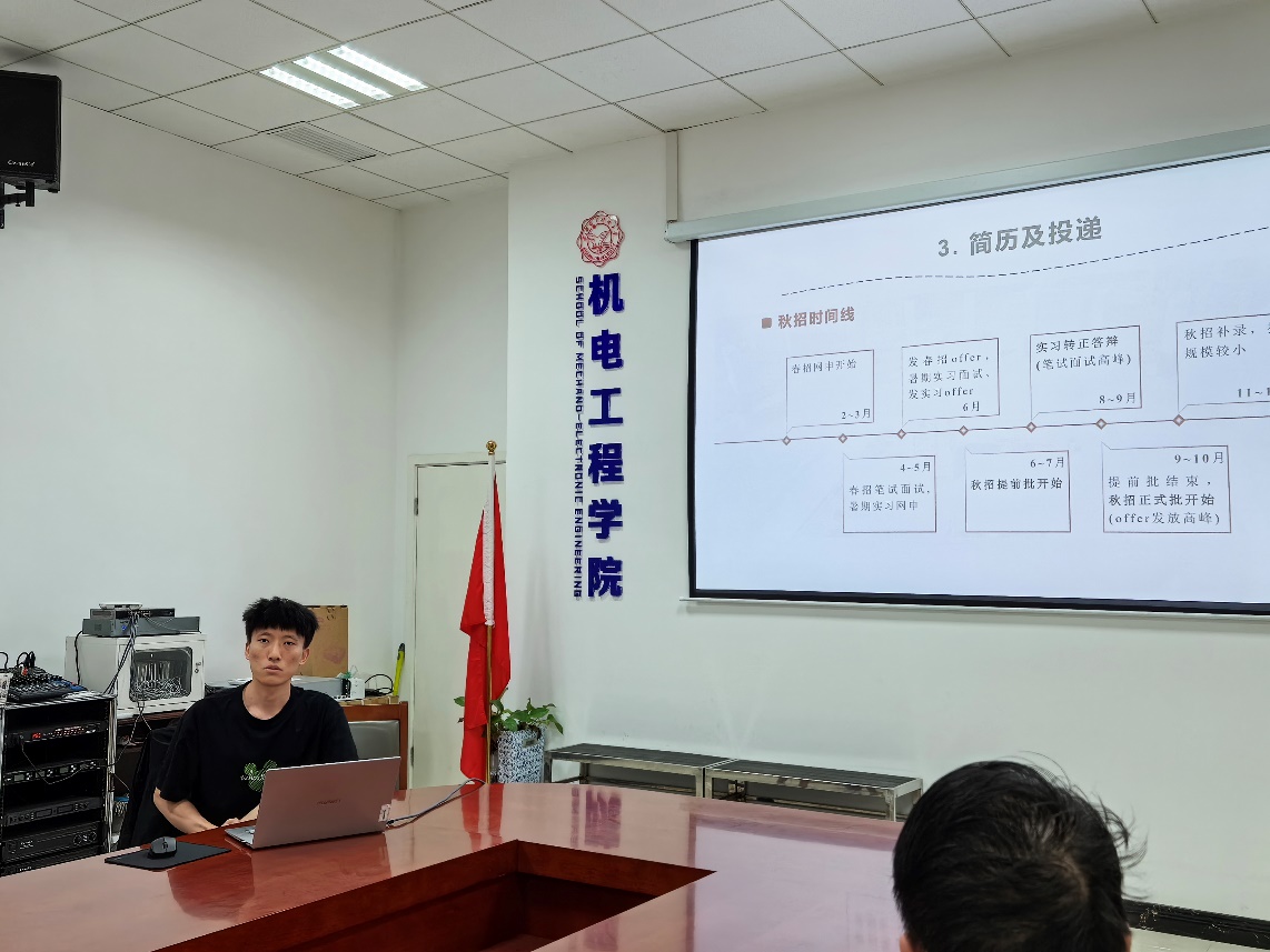 在主楼三区145北会议室举办“职”点迷津,前程有“道”研究生就业分享会,李腾浩、郭振宇、官腾、袁炀博、王学子等5名2024届硕士研究生受邀分享自己的求职经验。