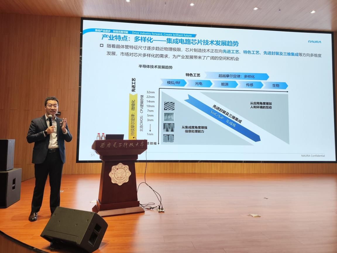 在前期科研项目、人才培养和产业链等方面合作的基础上,为学院“集成电路装备自强班”专门开设“制造强国”系列课程。10月9日下午,北方华创微电子装备有限公司总裁董博宇受邀在南校区会议中心B101报告厅讲授第一门系列课程第一讲——《集成电路装备产业概述》,“集成电路装备自强班”的200余名学生认真聆听了课程,北方华创总裁助理夏振军,人力资源中心高校关系总监王铮,学院相关系所教师代表、本科生辅导员代表在现场共同旁听了本次课程。