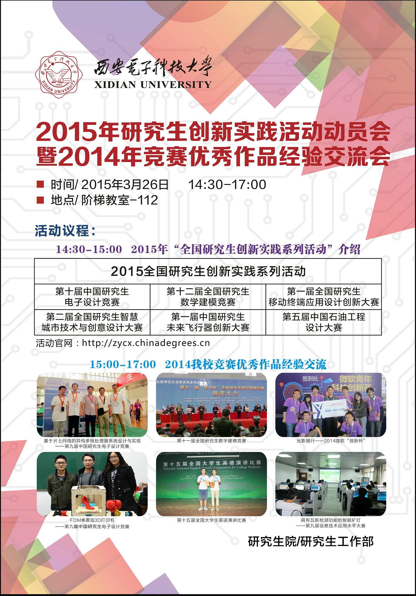 2015年研究生创新实践活动动员会暨2014年竞赛优秀作品经验交流会”。届时,将向大家介绍2015年研究生创新实践活动六大赛事的具体情况,并由 2014年度竞赛获奖优秀队伍介绍参赛经验。