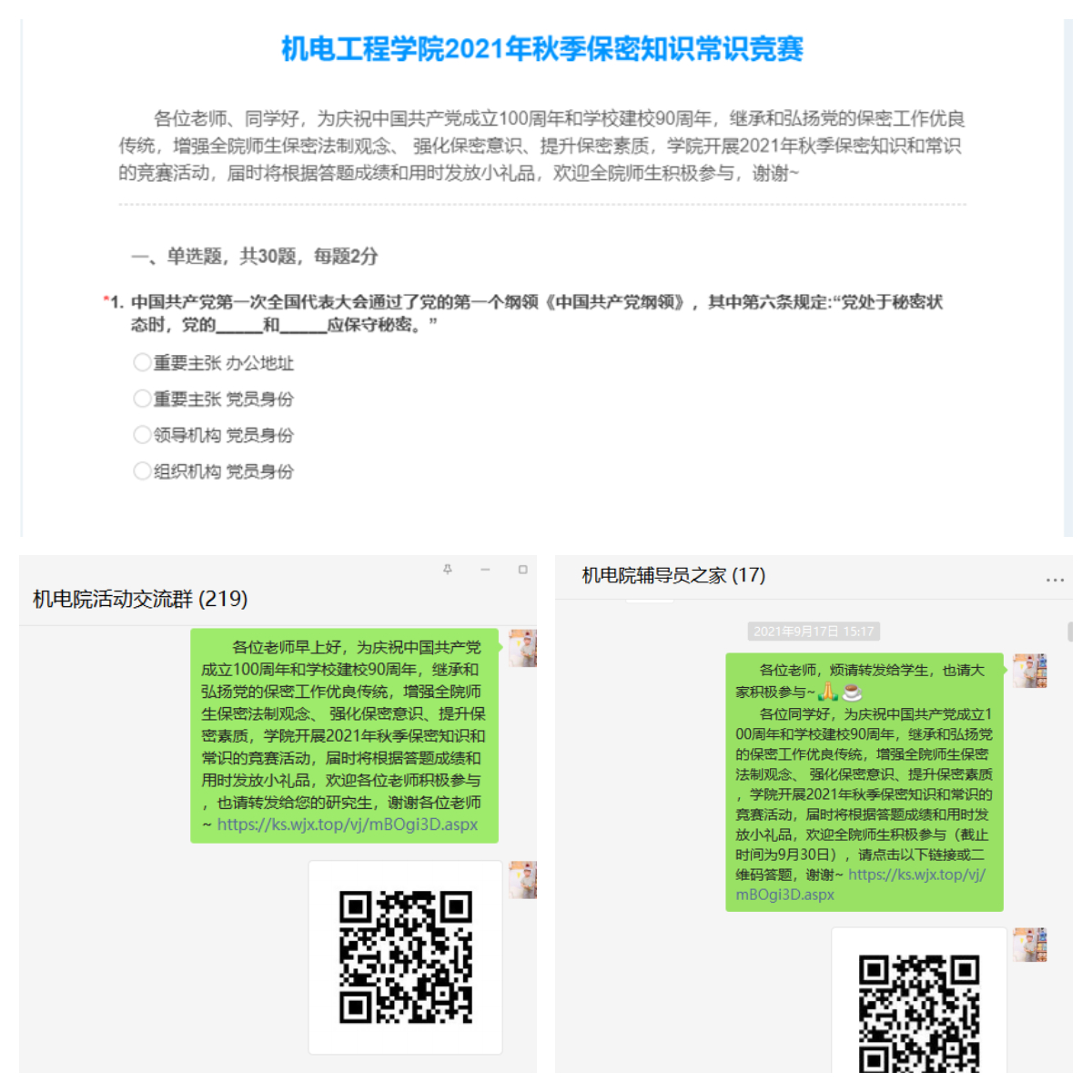 于9月中下旬开展了2021年秋季保密知识和常识竞赛答题活动,通过微信群、学院电子屏等多种方式动员全院教师和研究生积极参与。