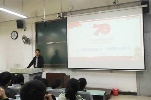 于10月21日下午4:00,在南校区A205以“70年披荆斩棘,70年风雨兼程”为主题开展主题党课,主讲人为学院党委副书记田雨。参加本次主题党课的有:各班班干部,学生组织主要干部,各辅导员老师。