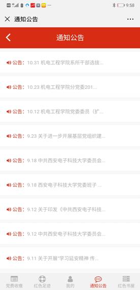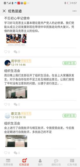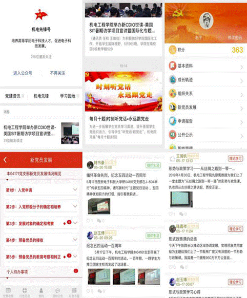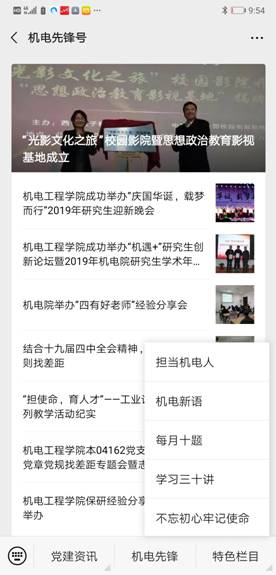 5.利用信息化手段促进基层党组织建设效率提升。依托学院党建微信公众平台“机电先锋号”搭载的“一云台两专栏四推送”---即“党建云”智慧管理系统平台,“党建资讯”、“特色栏目”两个专栏将党章党纪党规和专题教育的相关内容融于其中以及每月推送四次党建要闻宣传党的政策、传达上级精神、交流“不忘初心、牢记使命”主题教育的工作经验。特别是通过“机电先锋”党建云智慧管理系统平台大大提高了基层党组织的工作效率:通过“党费收缴”实现党费一键“秒交”,每月按时交党费,永远不忘共产党员身份;通过“红色足迹”方便分享党员个体的学习体会和成长经历,拉近了心与心的距离;通过“h漫通知